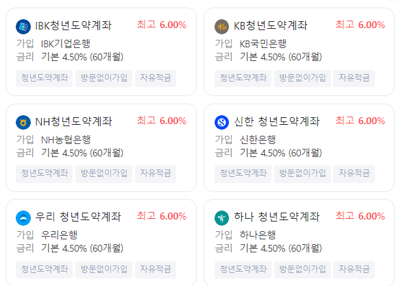 기본금리는 4.5%이고, 금리 우대조건을 모두 충족한다면 청년도약계좌 금리가 최대 6%까지 나옵니다. 우대조건은 은행별로 달라 가입하고자 하는 은행 우대조건을 확인해 보아야 합니다.